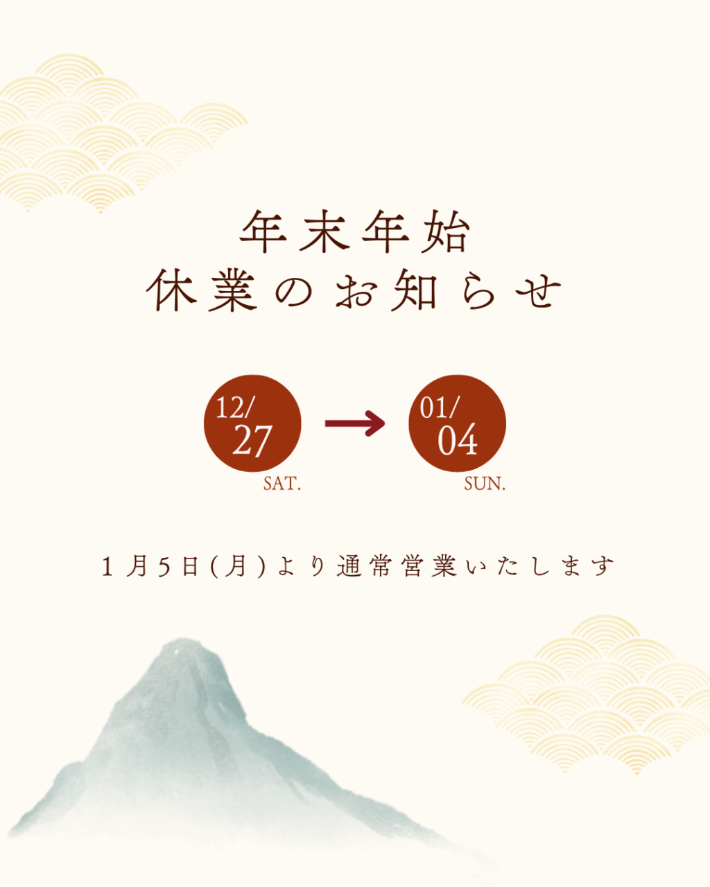 2025.12.15 お知らせ 年末年始休業のお知らせ 平素より格別のご愛顧を賜り、誠にありがとうございます。 誠に勝手ながら、弊社では下記期間を年末年始の休業とさせていただきます。 【休業期間】2025年12月27日(土)〜2026年1月4日(日) 休業期間中にいただきましたお問い合わせにつきましては、営業開始日以降、順次ご対応させていただきます。 本年も格別のご愛顧を賜り、誠にありがとうございました。来年も変わらぬご愛顧のほど、よろしくお願い申し上げます。 BACK